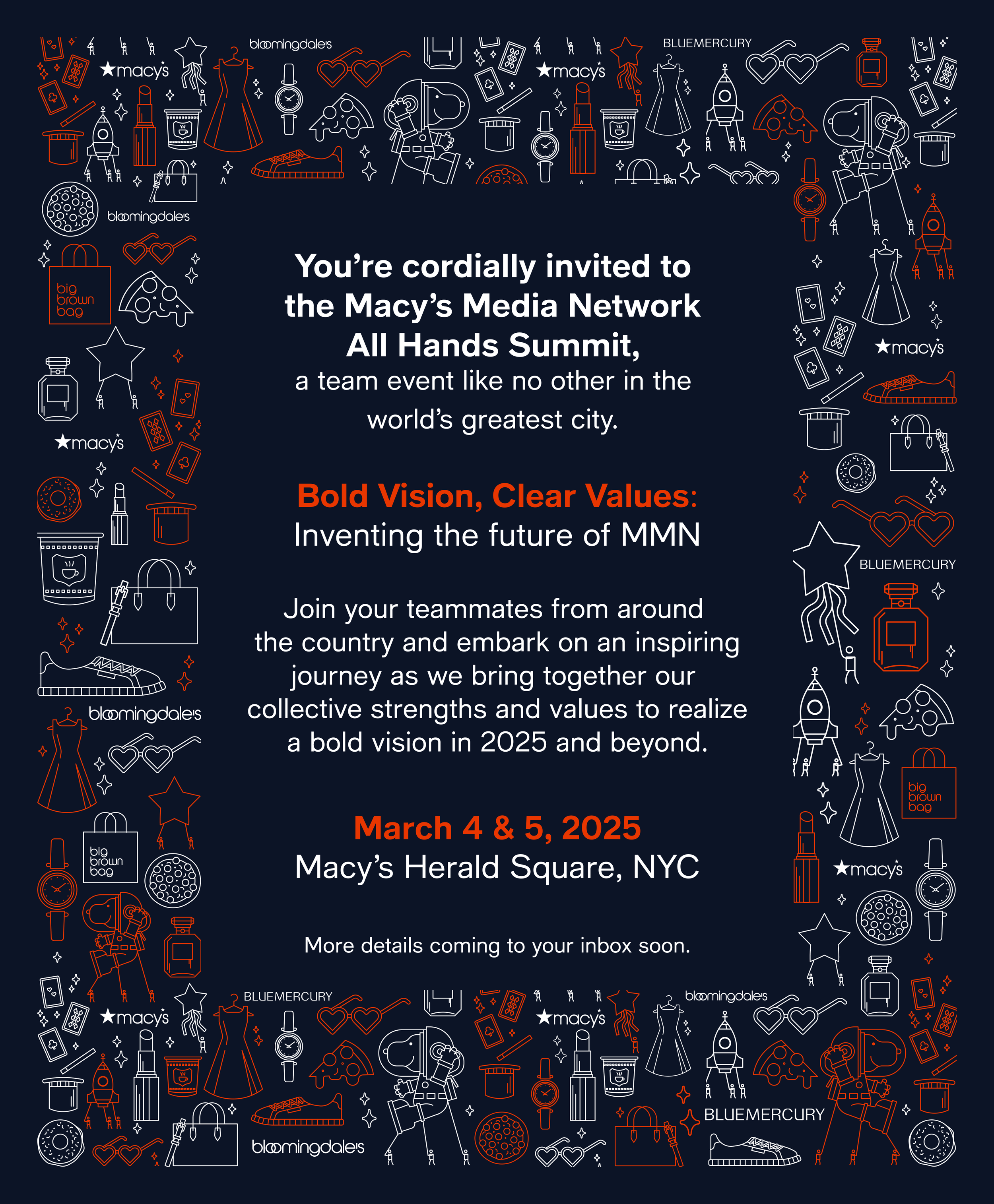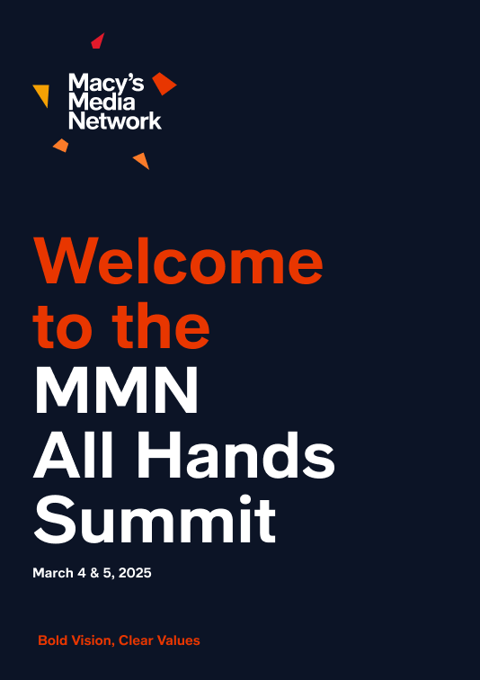 In March 2025, I worked with Adrianne Watson and Michael Krans to create a separate sub identity, patterns, illustrations, way finding, and print materials for the Macy's Media Network summit at our headquarters in Manhattan.